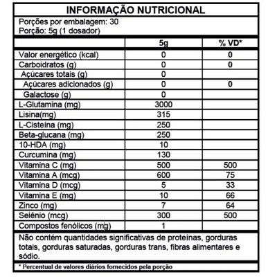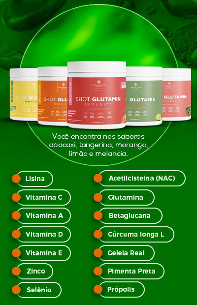 Com 3g de L-glutamina por dose, cúrcuma, pimenta preta, própolis, N-acetilcisteína, vitamina C, betaglucana, geleia real, lisina, zinco e selênio. Shot Glutamin Immunity é feito para oferecer mais vitalidade e refrescância à sua rotina.