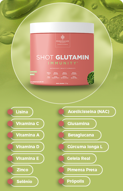 Com 3g de L-glutamina por dose, cúrcuma, pimenta preta, própolis, N-acetilcisteína, vitamina C, betaglucana, geleia real, lisina, zinco e selênio. Shot Glutamin Immunity é feito com delicioso sabor de Tangerina, para oferecer mais vitalidade e refrescância à sua rotina.