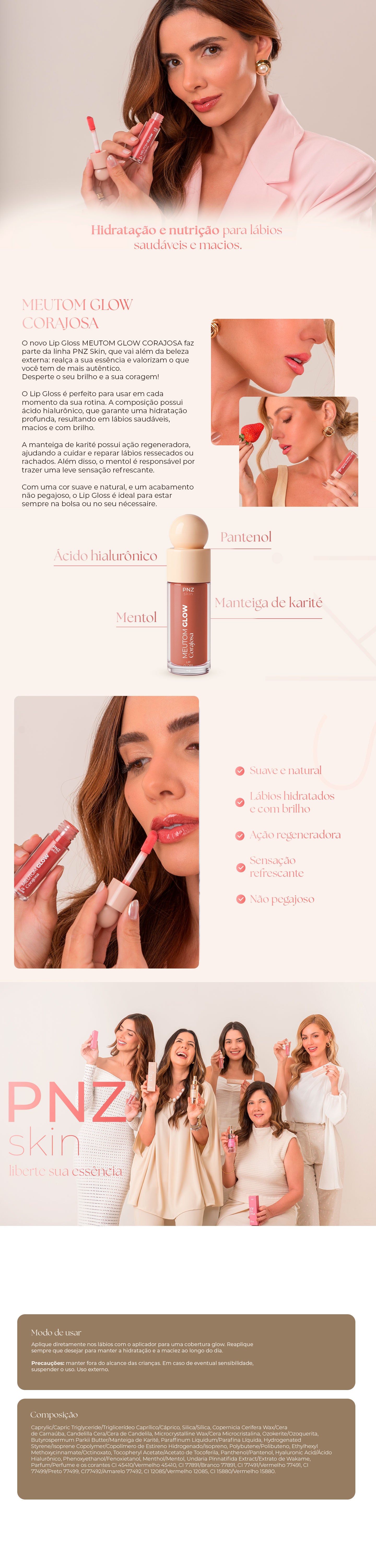O Lip Gloss MEUTOM GLOW CORAJOSA possui uma fórmula leve e confortável, que promove a sensação de hidratação nos lábios. Uma combinação poderosa de ativos, com ácido hialurônico, manteiga de karité, pantenol e mentol – que vão cuidar dos seus lábios, promovendo nutrição e cuidado enquanto você encara os desafios do dia a dia.
